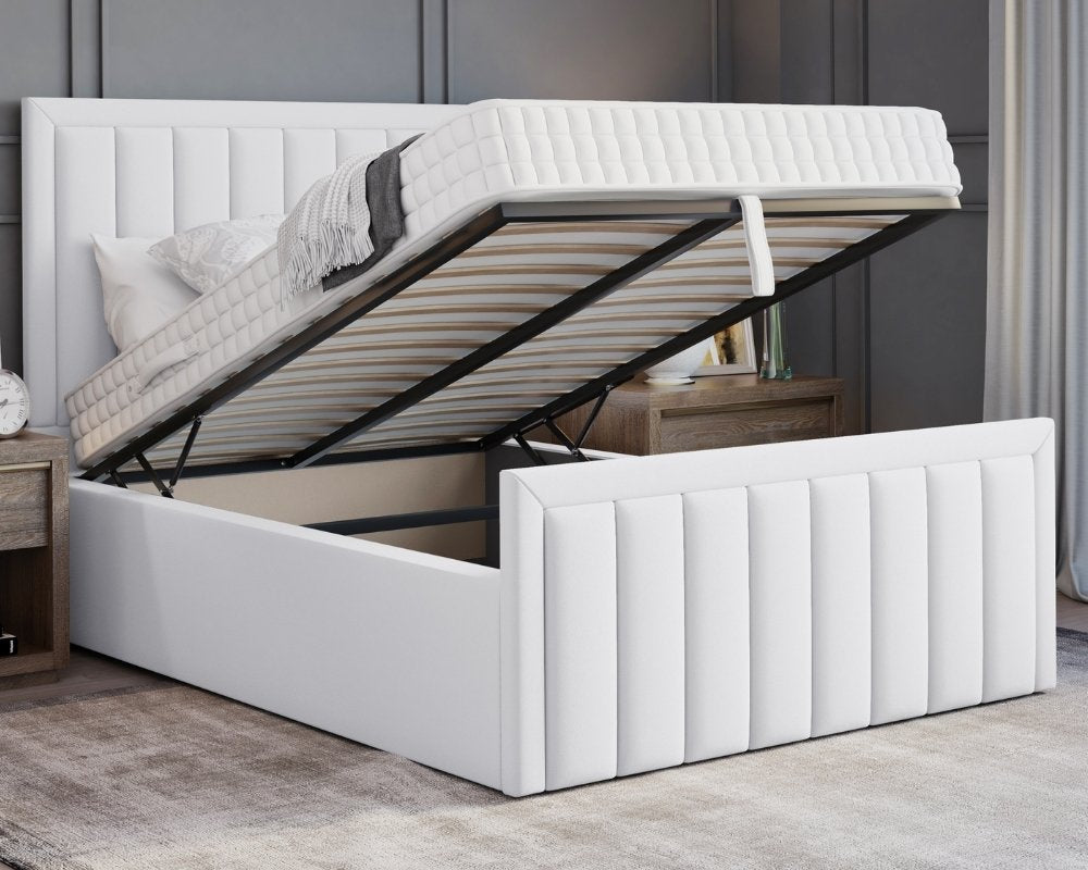 Designed for both ease and elegance, this gas lift bed features a sleek vertically paneled headboard and a generously padded footboard, blending comfort with hidden storage.